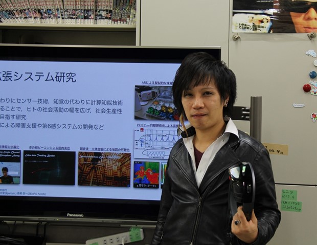 Prof. Zempo, who is conducting research on the application of augmented reality, further expands this concept to what he calls intelligence augmentation systems. He likes to compare this to a situation in which the Olympic athlete, the Paralympic athlete, and the cyborgs are all combined. If technology is used to complement the limited abilities or augment the disabilities of an individual, the possibilities of the individual will expand. For example, a person with a hearing disability could be provided with a head-mounted display through special goggles, which instantaneously convert the words spoken by another person into text information that is displayed as speech balloon. Or, a person with a vision impairment might be supplied with map information by auditory means, using stereophonic sound and ultrasound. Stereophonic sound is a technology that imparts a sense of the direction of the sound source angle. Using this, a small number of super-directive speakers can be controlled to supply omnidirectional information required only to those who need it, without requiring the installation of speakers at station ticket gates, restroom entrances, or the like. It might be called a technique for creating the perceptual illusion of the position of a sound source.