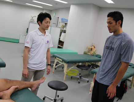 When a bone fracture, dislocation, or other injury occurs, the first step is medical treatment— involving surgery or other care—followed by medical rehabilitation to restore the original movement ability. Normally, that is enough, but for an athlete, the original level before the injury is completely different. To restore the ability to perform at the previous level, or even higher, requires athletic rehabilitation, including specialized training that goes a step beyond ordinary training. As an athletic trainer in charge of such tasks, Prof. Warashina provides support to many athletes, and educates younger students in the graduate school who want to become trainers.