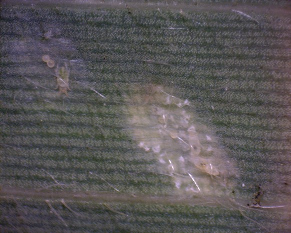 A shelter ofStigmaeopsis saharai mites on the underside of a bamboo leaf. This species does not expand their shelter, but instead builds a new one nearby. They build their bathroom area outside the shelter (the blackish area near the entrance to the lower right of the shelter).