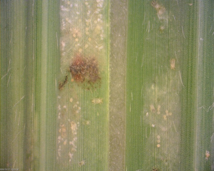 S. miscanthi shelters expanded into a tunnel shape. You can see adult mites, juvenile mites, eggs, and the bathroom area (brown area). The white objects are shed skins. The adult females (mites to the lower right of the bathroom area) are reinforcing the shelter's web by spinning silk while moving in a zigzag pattern. This also helps to clean the floor of the shelter (underside of the leaf) because dust and shed skins get stuck to the web that serves as the ceiling of the shelter.