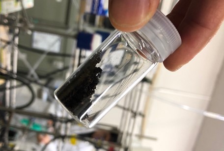 The newly developed organic material for solar cells. Because it absorbs nearly all light in the visible range, it is black, and it can absorb sunlight over a broad spectral range.
