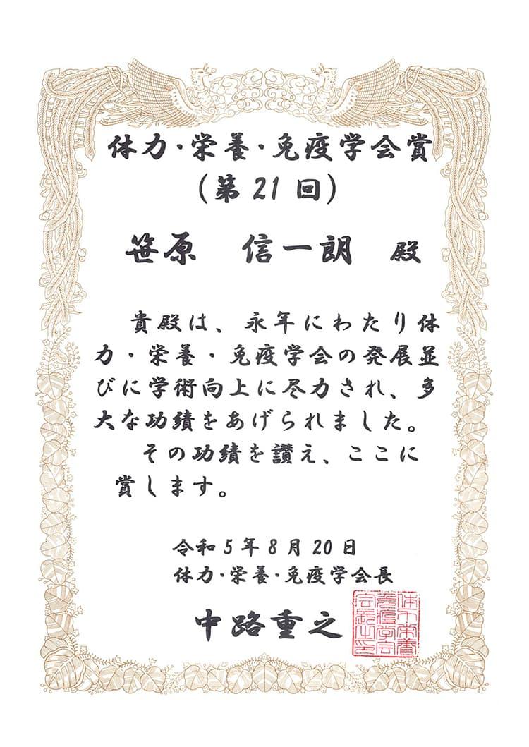 医学医療系の笹原 信一朗 准教授は、永年にわたり体力・栄養・免疫学会の発展並びに学術向上に尽力し、多大な功績をあげたことが評価され、体力・栄養・免疫学会賞を受賞しました。