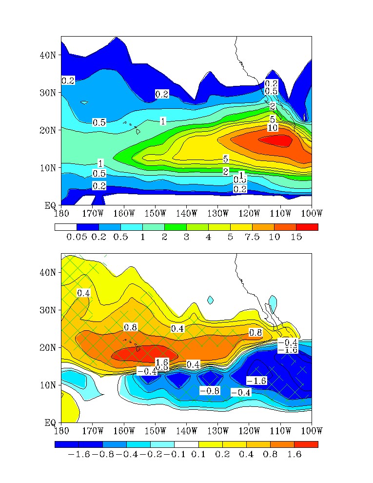 気象庁気象研究所気候研究部の村上裕之客員研究員と鬼頭昭雄前部長(現筑波大学生命環境系主幹研究員)は、ハワイ大学国際太平洋研究センターと共同研究を進め、最先端の高解像度全球気候モデルを用いて地球温暖化が進んだ21世紀末におけるハリケーン活動の将来予測を行い、2075年?2099年にハワイ付近に接近する熱帯低気圧の頻度が、1979年~2003年の平均に比べて2~3倍程度増加することを確認しました。