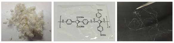 図 芳香族ポリアミドの合成直後の写真(左)、キャスト後に得られた透明フィルムの写真(中央)、繊維化後の写真(右)