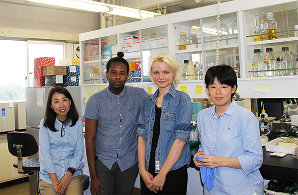 植物分子生物学者である木下さんの関心は、ブーケを受け取る天敵ではなく、植物にあります。ブーケを受け取った植物の対応の詳細がわかれば、実際に農場や植物工場などで応用できるのではないかと、夢は広がります。ですが目下は、シロイヌナズナというモデル植物とそれを食べるコナガの幼虫を材料に、基礎研究に打ち込む日々です。そのほか、イネのセシウム吸収に関する学内の共同研究にも参加しています。肥料のバランスを変えることで、セシウムを吸収しないようにしたり、逆にセシウムを選択的に吸収させて放射性セシウムの除染につなげる研究です。 木下さんは、英語での専門科目の授業も担当しており、研究室のメンバーも、アメリカ、ロシア、日本と多国籍。研究テーマだけでなく、教育も研究環境も越境中です。