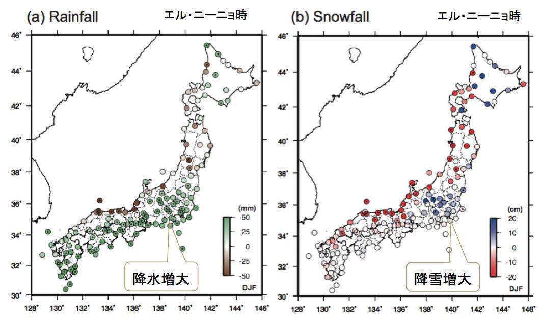 図 エル・ニーニョ時における(a)降水量と(b)降雪量の気候平均値との差(偏差)。値は12月から2月までの積算値。有意水準5%で有意な地点をドット(・)で示す。