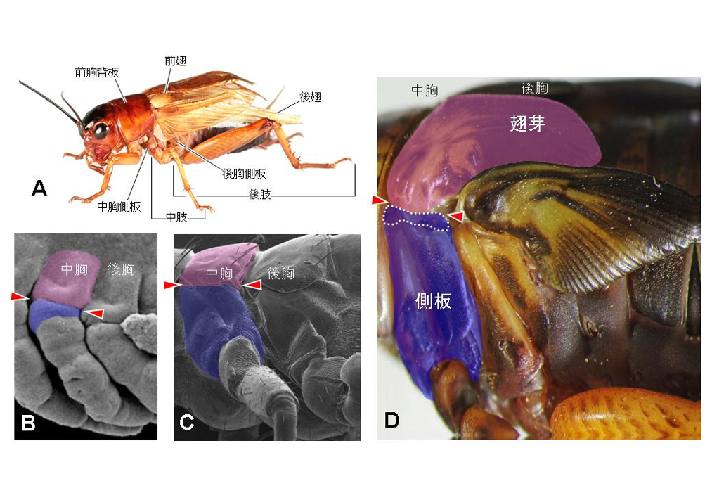 図 フタホシコオロギの成虫(A)と、中期胚(B)、1齢幼虫(C)と成熟(11齢)幼虫(D)の中胸節~後胸節の拡大。中胸節のみ背板をピンク、肢の最基部節である亜基節をブルーで示している。矢印は背板‐肢境界(BTA)。成熟幼虫(D)で分かるように、胸部の側面を被う側板は肢の亜基節に由来する。また、翅(翅芽)本体は背板に起源する一方、翅の基部関節(点線で示した領域)は側板、つまり亜基節に由来する。また、翅の筋肉系も亜基節環節の内在筋(側板の内側にある)起源である。このように、翅システムは、「背板」と「肢の基部環節(亜基節、つまり側板)」に由来することになり、翅の「二元起源説」が強く支持される。成虫(A)で「中胸側板」「後胸側板」と示した領域は、肢の最基部節である亜基節に由来した側板で、その上端に背板から形成された翅本体が関節する。