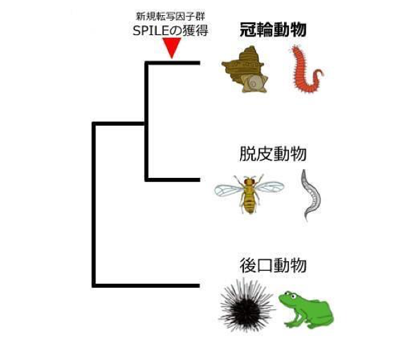 左右相称動物は、ヒトやウニを含む後口動物、ハエや線虫を含む脱皮動物、そして貝やゴカイを含む冠輪動物の3群に大別されます。本研究で、冠輪動物でTALE型の転写因子であるSPILE遺伝子群が獲得されていることが明らかになりました。