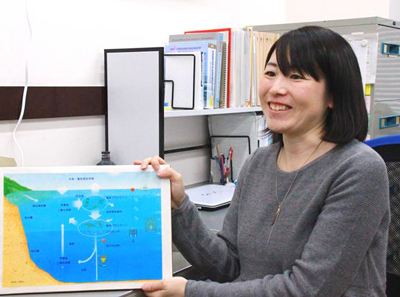 大学院を修了した大森さんは、一時、国立環境研究所の博士研究員となり、海と大気の相互作用に関する研究に従事しました。植物プランクトンやバクテリアが生成する硫化ジメチルという物質を追ったのです。ちょっと硫黄くさい、独特の磯の香り、その元が硫化ジメチルです。硫化ジメチルは海水に溶けにくいため、溶けきれなかった大量の硫化ジメチルが大気中に放出され、酸化されて、やがて硫酸塩に変化します。そしてこの硫酸塩が雲の元となる粒子になり、雲の形成につながるといわれています。つまり、海洋の小さい微生物によって作られる有機物が、地球の気象に影響を及ぼしているのです。大森さんたちは、研究観測船に乗り込み、硫化ジメチルの海洋から大気への放出量を実計測する新しい手法を開発・実用化しました。そして、硫化ジメチルの放出量に関する従来の推定値と大森さんたちの実測値の比較を行い、気候システムモデルの質向上に貢献しました。