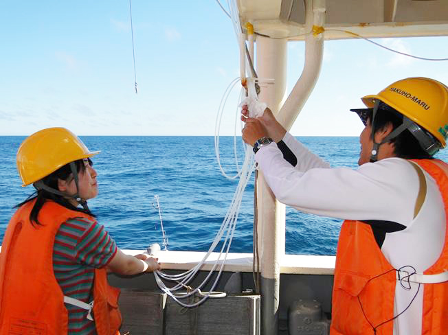 硫化ジメチルの量を測定するための観測装置を準備中の光景。手すりの向こうに測定装置の先端が見える。