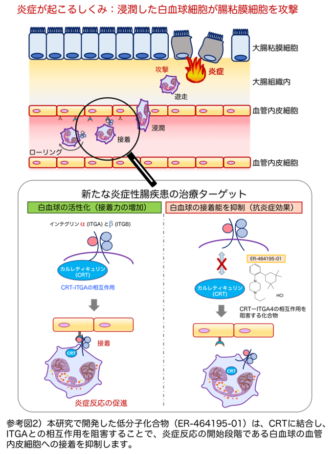 筑波大学 生存ダイナミクス研究センター(TARA)の深水昭吉教授らの研究グループ、およびエーザイ株式会社と、その消化器事業子会社であるEAファーマ株式会社は、エーザイが創出し、現在、EAファーマが治験中の炎症性腸疾患治療薬の類縁体と、筑波大学が開発したタンパク質間相互作用可視化マーカーを用い、本類縁体が、細胞内タンパク質のカルレティキュリン(CRT)と白血球の接着分子インテグリン(ITGA)の相互作用を遮断することにより、インテグリン活性化を阻害し、白血球全般の接着・浸潤を抑制するメカニズムを解明しました。