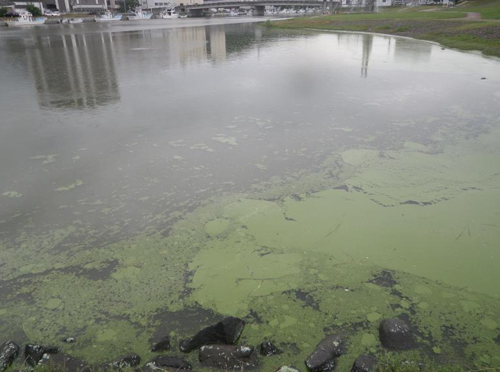 図 汽水で出現したアオコ(網走湖から流出する網走川、2017年)