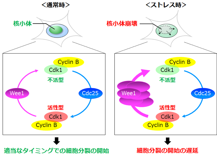 Cdk1キナーゼの活性は、Wee1キナーゼによるリン酸化で抑制され、それと拮抗するCdc25ホスファターゼによる脱リン酸化で活性化される。通常時は、Wee1キナーゼとCdc25ホスファターゼの絶妙なバランスにより、適切なタイミングで細胞はM期に進行する。細胞がストレスを受けた際にrRNAの転写が低下して核小体が崩壊すると、何らかのメカニズムでWee1キナーゼが蓄積してCdk1キナーゼの活性化が阻害され、M期の開始が遅延する。