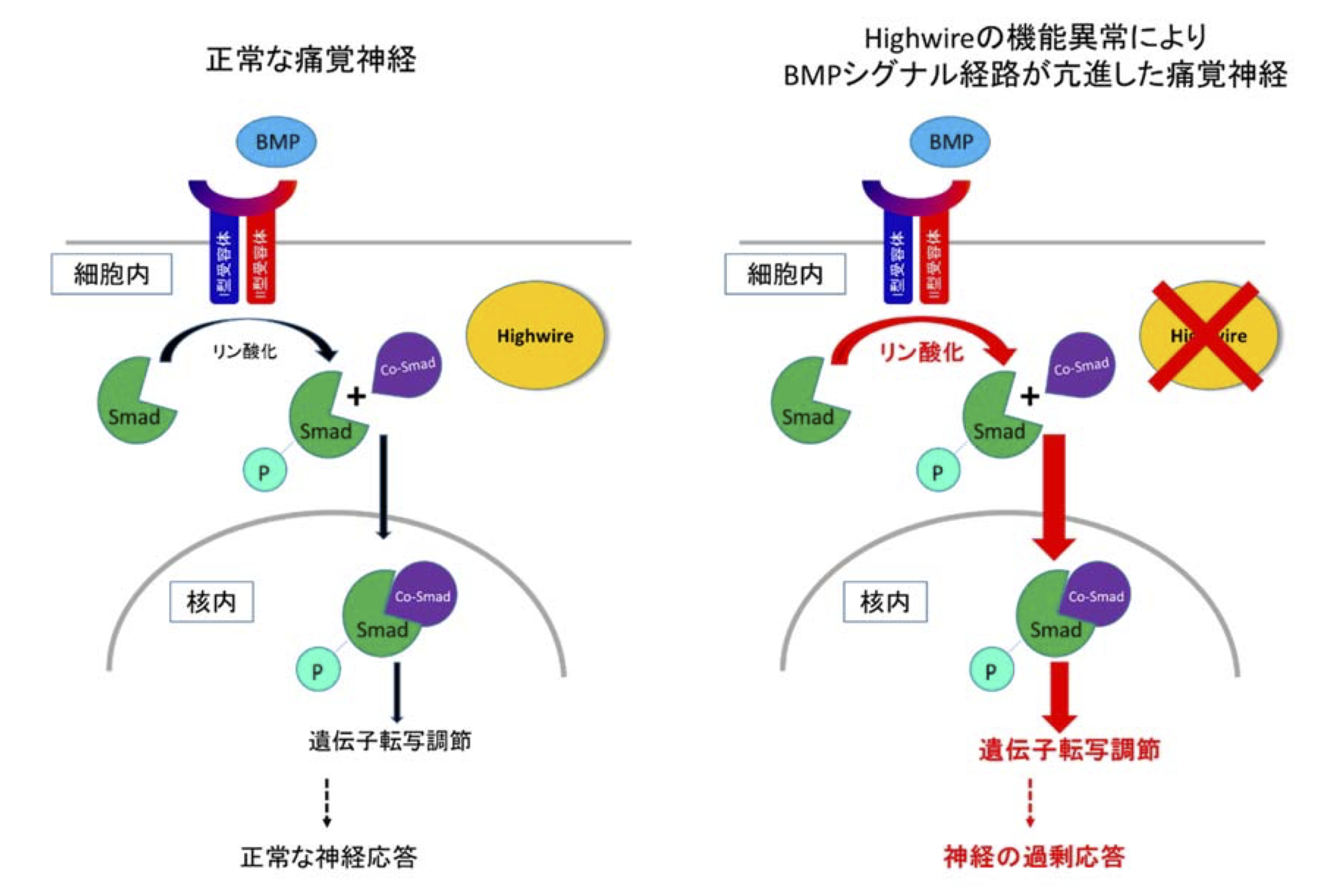 本研究では、本庄特任助教らの研究グループが2016年に報告した痛覚神経の機能に関わる新規遺伝 子の中から、Highwireの機能メカニズムに着目して解析を進めました。その結果、痛覚神経て?のHighwireの 機能異常は痛覚神経細胞内のBMPシク?ナルの過剰な活性化(亢進)を引き起こしており、この細胞内BMPシグナルの亢進が、痛覚神経の刺激への過剰反応、および個体レベルでの痛覚過敏を引き起こすことを突き 止めました。