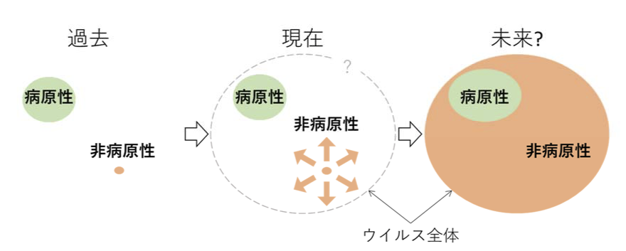 図 過去から現在のウイルス理解と、本研究により示唆される新たな"宿主と共存する"ウイルス像。従来知られるウイルスの殆どは宿主にダメージを与える病原性のものであった。本研究では、少なくとも RNA ウイルスにおいては、非病原性ウイルスの多様性が従来のウイルス像と比べ、遙かに大きなことを示した。今後の研究如何によっては、病原性を有すウイルスは極限られたものであることが示されるかもしれない。