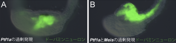 A:Ptf1a のみを過剰発現した幼生。B: Ptf1a と Meis の遺伝子カクテルを導入した幼生。緑色はドーパミン神経を示している。遺伝子カクテルの導入により脳の全ての細胞がドーパミン神経へと変換した