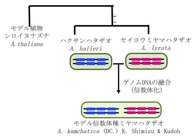 図 モデル倍数体種ミヤマハタザオは、ハクサンハタザオのゲノム DNA(青色)とセイヨウミヤマハタザオのゲノム DNA(赤色)を併せ持つ四倍体の種である。本研究では、このように複雑な構成を持つ倍数体のゲノムの解析技術を開発した。