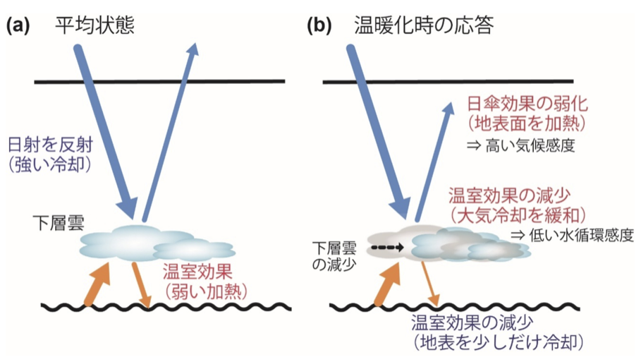 図 温暖化に対する下層雲の応答が、平衡気候感度と水循環感度を結びつけるメカニズム。(a)平年の状態では、下層雲は日射を反射することで(日傘効果)地表面を冷やす一 方、弱い温室効果をもつ(正味では冷却が勝っている)。(b) 温暖化時に下層雲が減ると、 日傘効果が弱まることで正の雲フィードバックが強まり、これは平衡気候感度を上昇させ るように働く。同時に、雲の温室効果減少に伴って、大気からの長波放射増加(大気を冷 却する)が抑制され、それとバランスすべき蒸発の増加(すなわち降水の増加)も抑制される。