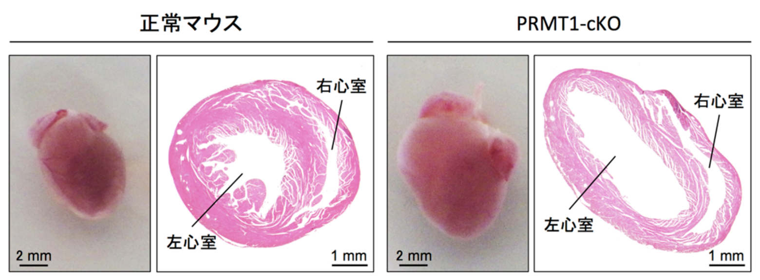 各マウス左側の写真は心臓の外観を示しており、PRMT1-cKOマウスでは全体的に心臓が大きくなっている。各マウス右側の写真は心臓の断面図であり、ピンクに染まっている部位が主に心筋細胞で構成される心臓の壁(心室壁)である。PRMT1-cKOマウスでは左心室の内腔が顕著に広がっている。