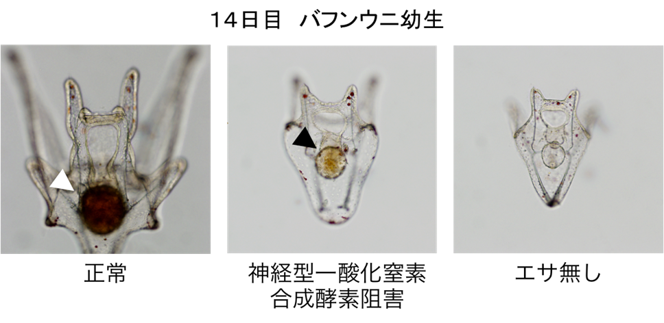 一酸化窒素は幽門開口をコントロールしている。(A)正常なウニ幼生は消化管にエサである珪藻を大量に取り込み(白矢尻)、消化・栄養吸収をして14日目には後期6腕幼生になる。(B)神経型一酸化窒素合成酵素の機能を阻害された幼生では、胃まではエサが入るが(黒矢尻)幽門開口がスムーズにいかないため、多くを取り込むことができない。そのため、消化や栄養吸収に不具合を生じ、エサを一切与えていない幼生と同程度にしか成長できない。