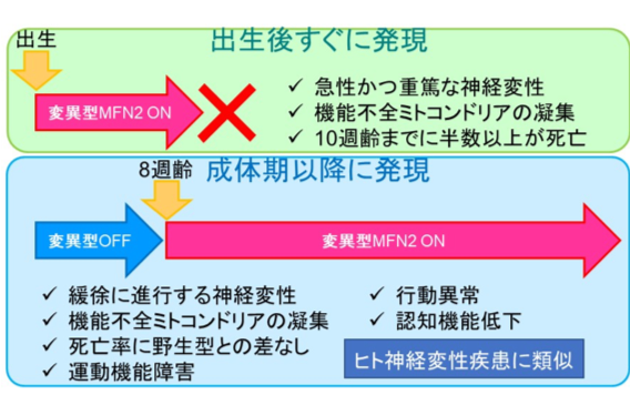 2. 同じ変異体でも、発現させるタイミングによって症状の程度が大きく異なることを発見しました。 3. 神経細胞の機能維持におけるMFN2の重要性を証明しました。