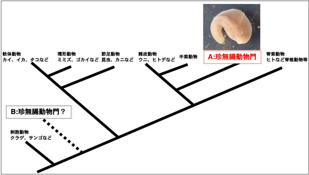本研究では、現在生きている動物の中で、棘皮動物や半索動物に近縁であるという説(A)が支持された。それに対し、2016年の論文等では、左右相称動物の根元で分岐した動物であるという説(B)が提唱されていた。写真は日本近海に生息する珍渦虫Xenoturbella japonica。