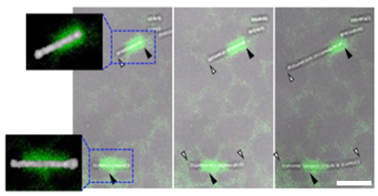 図 鉄酸化細菌が表面接着後、細胞フィラメント伸長を開始した時点で分泌ナノ繊維を蛍光ラベルした結果、片側・両側に伸長する場合に異なる分泌ナノ繊維の分布を示す。矢印は伸長端(白)、固定部分(黒)を示す。スケールバー = 5μm