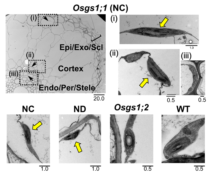 (図 透過型電子顕微鏡によるOsgs1;1 変異体(NCおよびND)、Osgs1;2変異体および野生型(WT)根の切片観察結果。Osgs1;1変異体(NC、ND)は光合成を行わない根に葉緑体が形成されている(黄色矢印)。WTおよびGS1のアイソザイムであるOsgs1;2の根では葉緑体形成は見られなかった。)