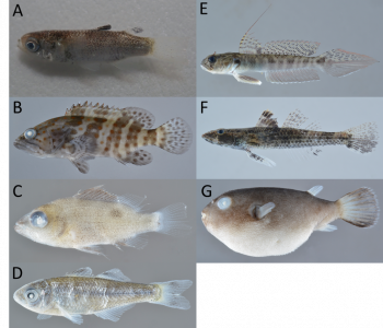 図 今回、相模湾周辺で記録された熱帯・亜熱帯性魚類7種。A. オニボラ; B. チャイロマルハタ; C. ニセクロホシフエダイ; D. オオクチユゴイ; E. カマヒレマツゲハゼ; F. ヒトミハゼ; G. カスミフグ。いずれも瀬能宏学芸員が撮影。(今回の発表論文から転載)
