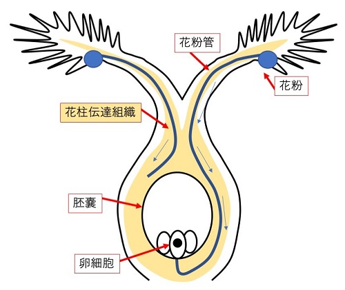雌しべの柱頭についた花粉は、花粉管を伸ばして柱頭の中に入りこみます。さらに通り道である花柱伝達組織の中を下に伸びて胚嚢に到達します。花粉管の中の精細胞は卵細胞と受精し種子を形成します。