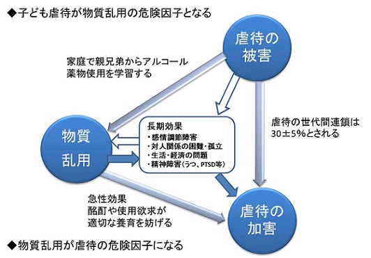 晴らすうちに依存が成立する。さらに、被虐待経験や依存症をもつ人が親になって子どもを虐待