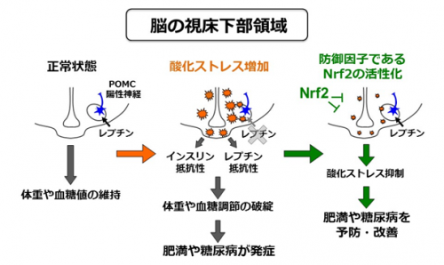 図 脳視床下部領域の酸化ストレスによる肥満・糖尿病発症のメカニズムと視床下部領域のNrf2を標的とした肥満・糖尿病の発症予防および改善作用。