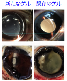 図 ウサギを用いた動物モデルにおいて、硝子体を切除した後に本ゲルを眼内に充填し、1年以上にわたる安全性を確認した。充填後、既存のゲルでは眼内が混濁するが、新たなゲルは透明のまま。