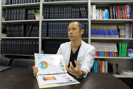 網膜は眼球のいちばん奥にあり、レンズ(水晶体)で集めた光信号をキャッチして視神経に送る重要な組織です。そこに不具合が生じると失明に至ることもあります。この網膜を眼球の内側に押さえつけているのが、眼球内を満たしている硝子体(しょうしたい)というゲル状の物質です。成分のほとんどは水なのですが、外からの衝撃や老化、炎症などによって状態が変化すると、網膜にさまざまな病気を誘発します。そのような網膜疾患の治療では、硝子体を取り除く手術が必要となります。岡本さんは、年間数百件もの硝子体手術をこなしている眼科の専門医です。
