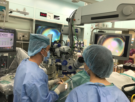 硝子体手術では、眼球に髪の毛くらいの細い器具を挿入し、顕微鏡を覗きながら、網膜と硝子体とを慎重に切り離していきます。30-60分程度の手術も日に10件以上も続くと肩や腰は辛くなりますが、顕微鏡下の手術なので、年をとっても大丈夫。技術が衰えることなく、長く現役医師を続けられることも眼科の利点だそうです。第一線で診療に携わりつつ、自分が開発した材料が多くの人に使われるようになる。臨床医としてこれ以上のやりがいはありません。