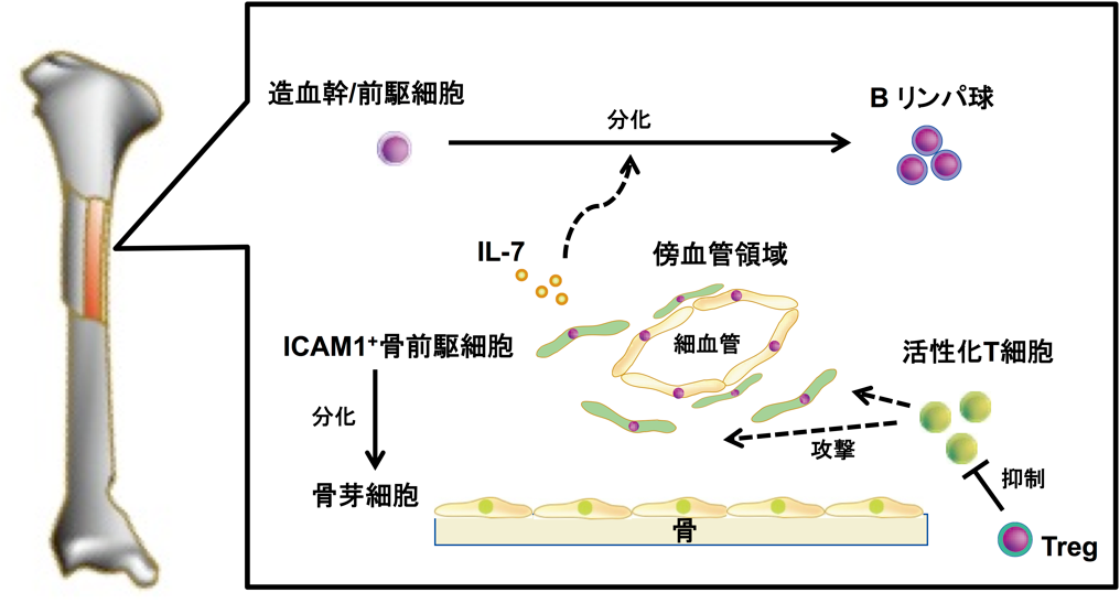 図 免疫反応を抑制的に制御する制御性T細胞(Treg)が、骨髄内の細血管近傍に位置するICAM1骨前駆細胞を活性化することで、サイトカインであるインターロイキン7(IL-7)が分泌される。IL-7が造血幹/前駆細胞に働きかけるとBリンパ球造血が促され、結果的に免疫不全の解消に効果を発揮する。