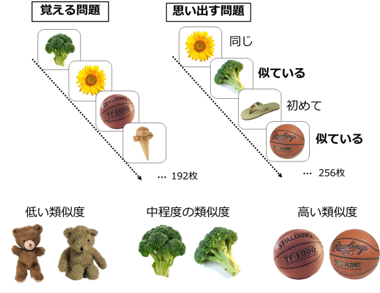 図 記憶テスト 覚える問題では、192枚の物体の写真を2秒間ずつ見せた。思い出す問題では、覚える問題で出題した物体と同一、類似、無関連いずれかの物体を計256枚提示し、参加者には全く同じか、似ているが全く同じではないか、初めて出てきた新しい物体か、の3択で回答させた。類似物体は類似度により3段階に分類した。