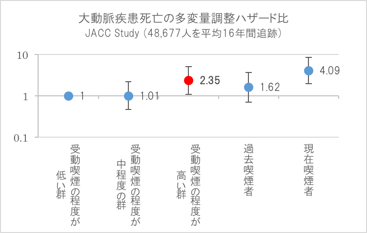 ハザード比は受動喫煙の程度が低い群を基準とし、性別、年齢、Body Mass Index、高血圧の有無、アルコール摂取、ストレス、散歩、教育、仕事、地域にて調整。図中の●はハザード比を、その上下の棒が95%信頼区間の範囲を示す。