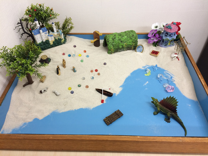 後ろに並んでいるのは箱庭療法に用いるフィギュア類