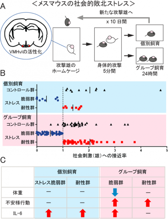 女性においては、うつ病や不安障害の発症率が男性よりも高いことが知られています。また、ストレス性障害における生物学的基盤には性差があることも示されています。しかし、モデル動物研究の多くは雄に偏っています。本研究では、雄マウスが雌マウスを攻撃するという異常な攻撃行動を引き起こすことで、雌マウスにおける社会的ストレスの影響を調べるための実験系を確立しました。この社会的敗北ストレスを受けた雌は、体重が減り、不安様行動を示すようになり、免疫系にも異常が生じることが明らかになりました。