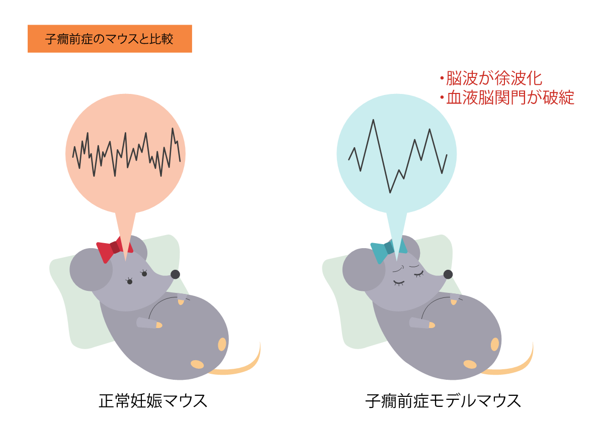 本研究では、健康な妊娠マウスにおける睡眠の変化を解明するとともに、子癇前症モデルマウスでは、血圧が急激に上昇する妊娠後期に、脳波の周波数の全般的な低下が見られ、血中の物質が不用意に脳に入るのを制限するしくみである血液脳関門が一部破綻していることが明らかになりました。この病態は、ヒトにおける子癇発作時の病態とさまざまな点で類似しており、このマウスが子癇モデルマウスとして有用であると考えられます。