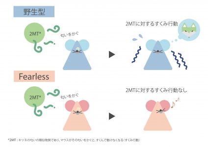 図 フォワード・ジェネティクスにより樹立したFearless家系では、捕食者であるキツネの臭いの類似物質(2MT)をかいだときの本能的な恐怖行動が減弱(減少)していた。