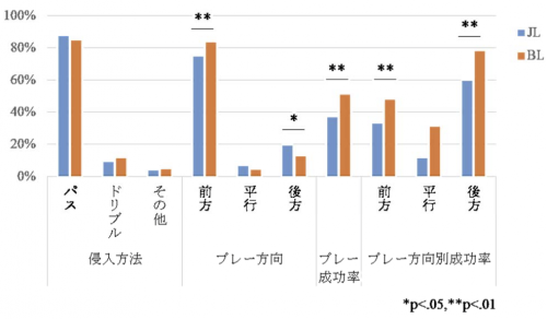 図 DF-MF 間て?のフ?レーに関する測定項目の生起率およひ?成功率の比較。JL は BL よりも DF-MF 間て?受けたホ?ールを前方へ運ふ?割合か?低く、フ?レー成功率も低いことか?示されました。
