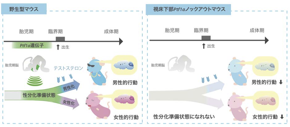 図 Ptf1a 遺伝子が胎児期に視床下部で働き、脳が「性分化準備状態」になる。 その後、臨界期になるとテストステロンの刺激・非刺激によって男性脳・女性脳 (オス脳・メス脳)へと性分化する。視床下部の Ptf1a 遺伝子を破壊したノック アウトマウスでは脳が「性分化準備状態」になることができないため、臨界期で のテストステロン刺激の有無に関わらず正常に性分化することができない。