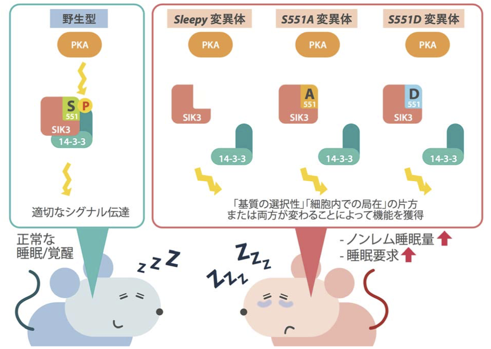 S551A・S551D・Sleepy(S551 を含むエクソン 13 欠損型)の3系統の変異型 SIK3 タンパク質では、リン酸化酵素PKA からの認識が減弱し、標的タンパク質の細胞内局在を司る 14-3-3 タンパク質との結合が失われる。その結果、SIK3 の基質特異性や細胞内局在が変化し、過眠の表現型に至ると示唆される。SIK3のS551が1日の睡眠量や睡眠要求量(眠気)を規定する上で重要な役割を担っている。