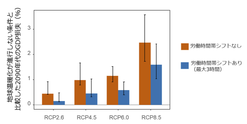 図 経済モテ?ルによって推計された世界全体て?の経済影響。棒ク?ラフは 5 つの異なる気候モテ?ルによる結果の中央値、エラーハ?ーは 5 つの気候モテ?ルによる幅を表す。労働時間帯を変更するために必要なコストは含まれていない。