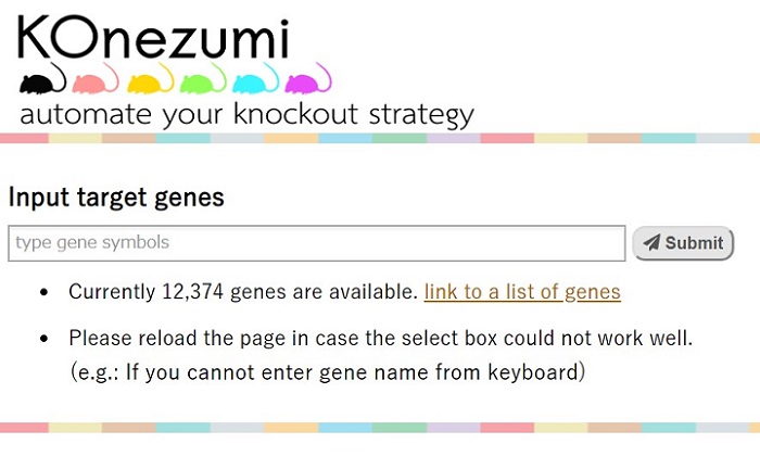 "KOnezumi"は、研究者が興味のある遺伝子名を入力するだけでその遺伝子をノックアウトするために必要な情報を全自動で入手できるWebツールです。KOnezumiは、利用者が目的とする遺伝子名を入力するだけで、ノックアウトマウス作出のために必要な情報を瞬時にレポートします。また、従来の方法ではとても手間がかかっていた複数の遺伝子に対するノックアウトマウス作出戦略の構築にも対応しています。KOnezumiの利用によってさらに多くの研究者がノックアウトマウスを作製することで、医学生物学研究のさらなる発展が期待されます。