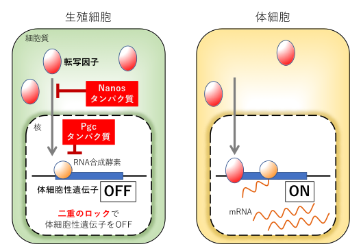 Nanosは、体細胞性遺伝子(青丸)の転写に必要な転写因子(赤丸)の細胞質から核への移送を抑制し、Pgcは、RNA合成酵素(オレンジ丸)の働きを抑制する。このような二重のロックにより体細胞性遺伝子の発現が強固に抑制される。一方、体細胞では、NanosおよびPGCによる抑制がないため、転写因子が体細胞性遺伝子上流に結合し、RNA合成酵素がmRNA(赤波線)を転写する(体細胞性遺伝子の活性化)。
