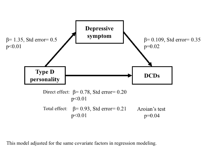 図 タイプD性格とうつ症状とせん妄・昏睡期間の関連性の媒介因子解析