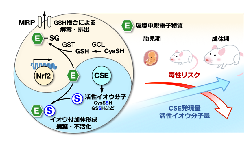 本研究では、転写因子Nrf2と活性イオウ分子産生酵素CSEが、異なる経路を介して環境中親電子物質の毒性を抑制する鍵分子である事を、遺伝子改変マウスを用いて明らかにしました。このことは、従来のグルタチオン-抱合反応を介した解毒・排出機構に加え、活性イオウ分子による、イオウ付加体形成を介した捕獲・不活性化機構が環境中親電子物質の抑制に重要であることを意味しています。さらに胎児性水俣病などに代表される、胎児期における環境中親電子物質に対する虚弱性の要因に、CSEと活性イオウ分子が関与している可能性も示唆されました。